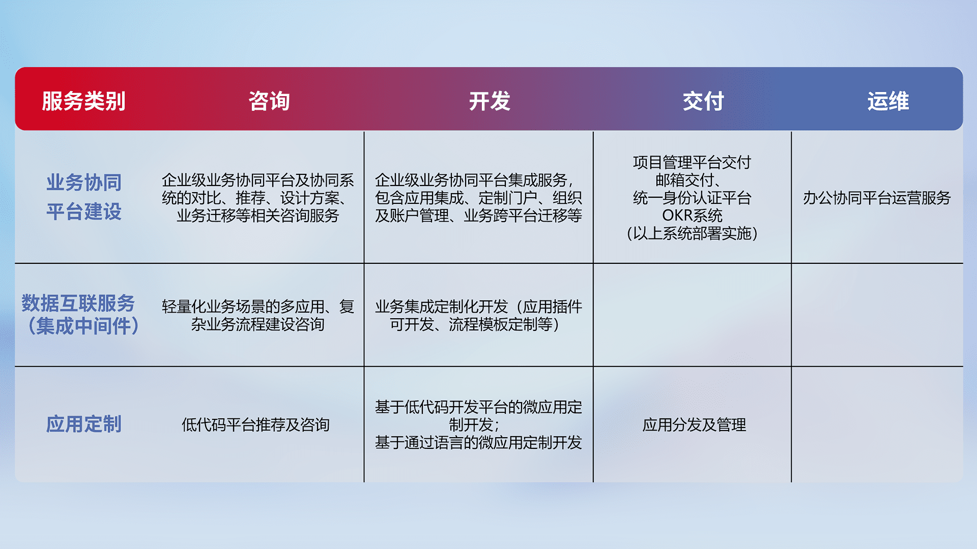 针对钉钉、、、、企微、、、、IDaas等平台级产品提供产品的规划、、、、方案、、交付、、、、定制化开发等服务,,,实现如统一协同办公、、、智能客户服务、、、、混合会议管理、、、智能数据查询、、、等业务场景,,,实现数字化转型。。。